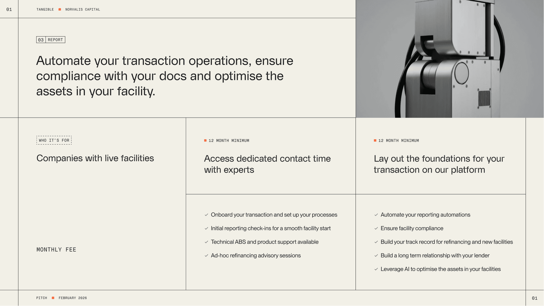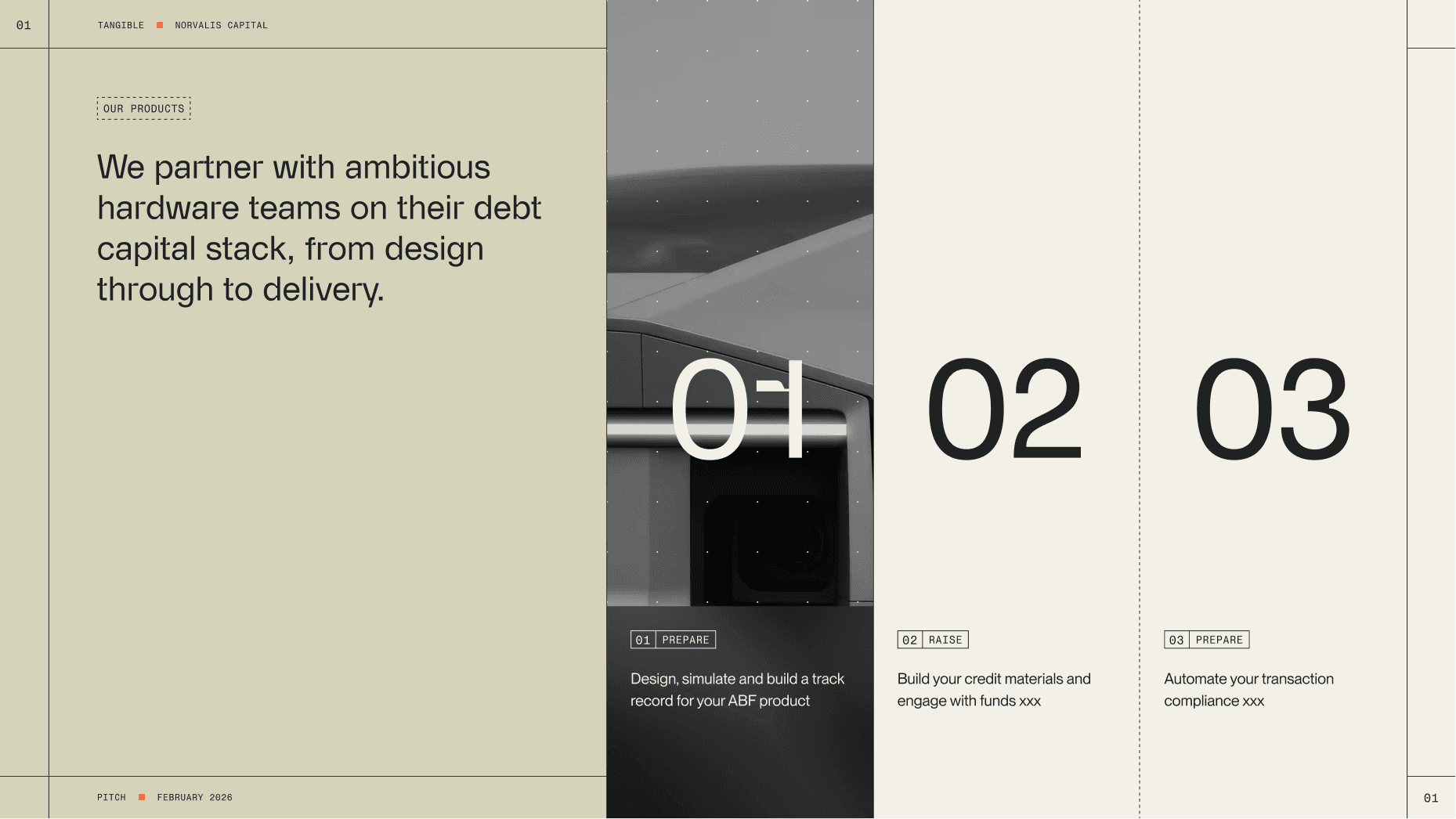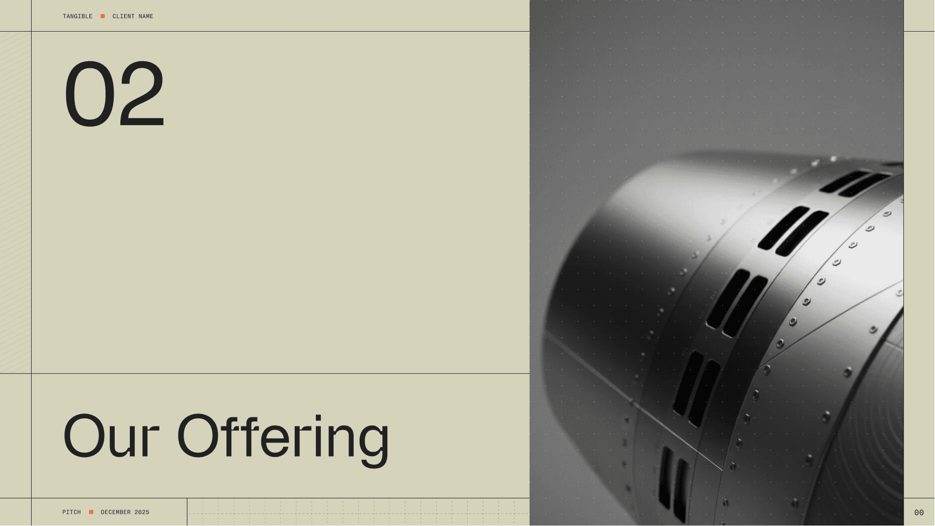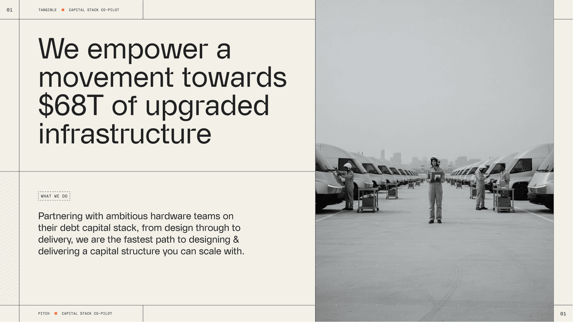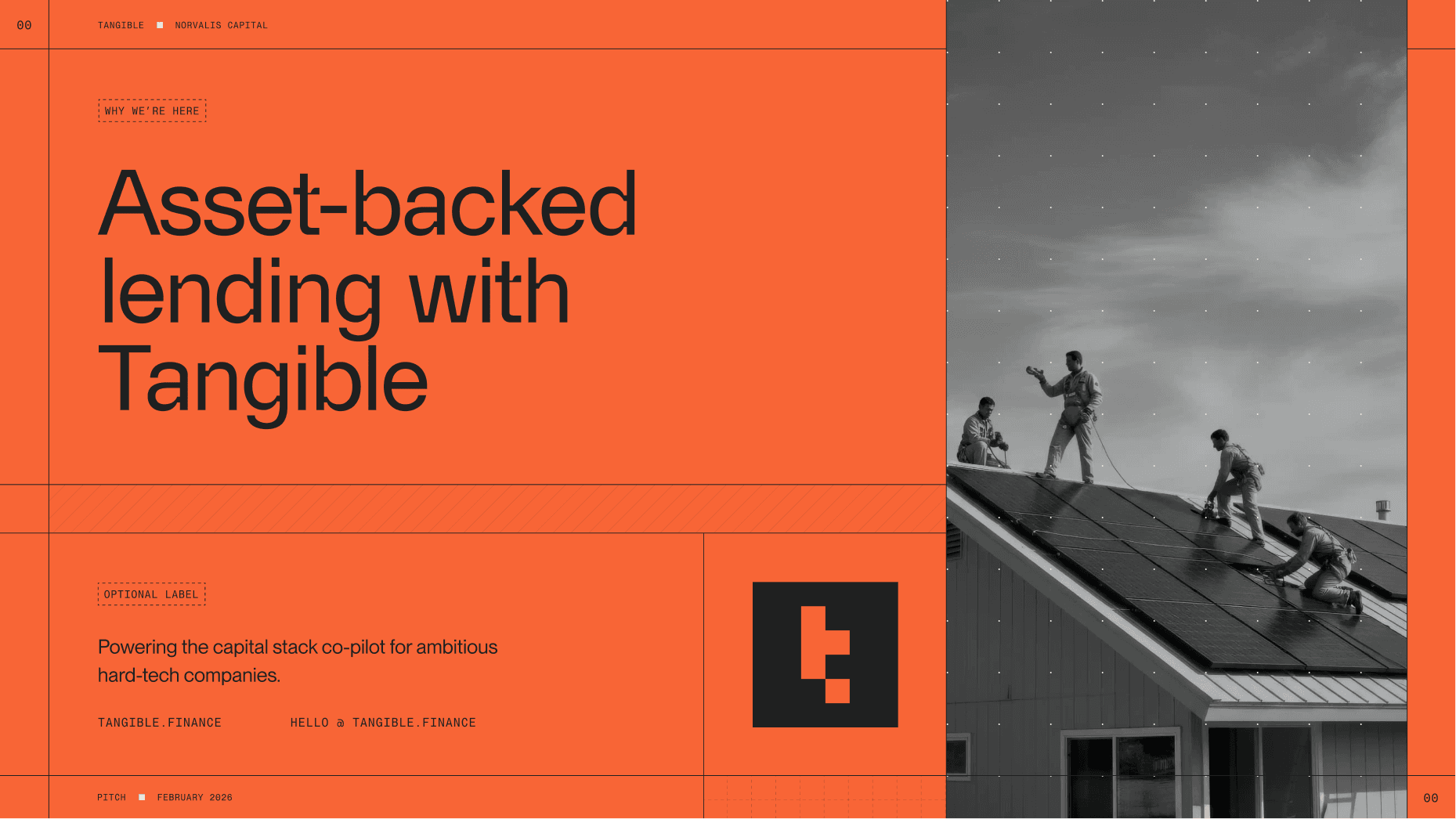 Tangible sits at an unusual intersection. On one side, institutional lenders: corporate and risk-conscious, but fluent in the language of finance. On the other side, hard-tech innovators: ambitious dreamers who know everything about manufacturing their niche hardware but nothing about how fund it properly. The brand had to earn the trust of both, while giving borrowers the tools and language to move forward with confidence. We defined Tangible as the bridge between physical infrastructure and digital intelligence – the financial engineering for your real-world engineering.