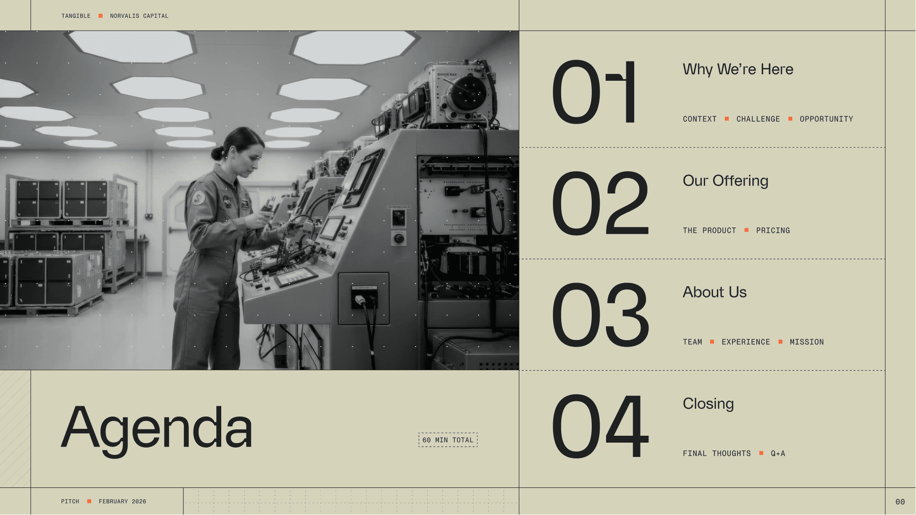 The visual identity is rooted in precision and structure. Cues from classic engineering environments include bold, humanist typography, a minimal, stark colour palette inspired by industrial design legends like Braun, and references to technical drawing conventions in a structured grid – a feast for any hardware nerd. The moving pixel motif and translucent UI surfaces reinforce Tangible's role as a digital layer, harnessing automation and data to amplify impact in the physical world.